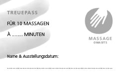 Der praktische TREUEPASS: Jede in Anspruch genommene gewerbliche Massage wird eingetragen und nach der zehnten Behandlung erhalten Sie auf die elfte Massage 50% Rabatt!